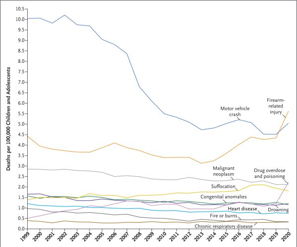 In a study done by the National Library of Medicine in 2020, deaths in children from firearm related injuries beat out motor-vehicle crashes by about 50,000 people. A baffling statistic, but a factual one. The chart below proves this idea beyond a shadow of a doubt.